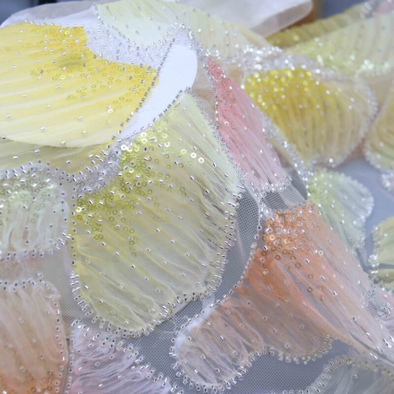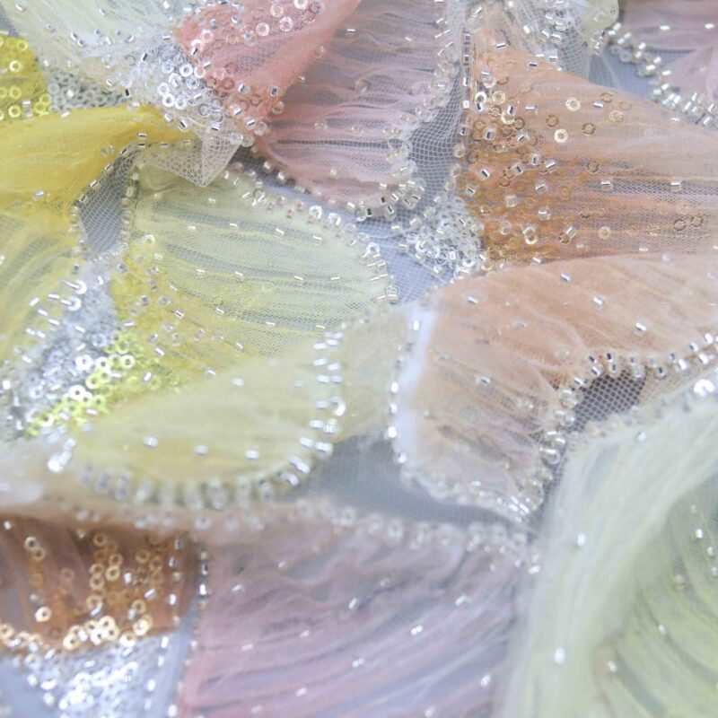 YiTuo Designer presents Aurora Pink, an enchanting beaded lace fabric capturing the ethereal beauty of dawn’s first light. Delicate petal-shaped appliqués in soft pastels—blush pink, coral, lemon yellow, and mint green—dance across a luminous periwinkle mesh base.