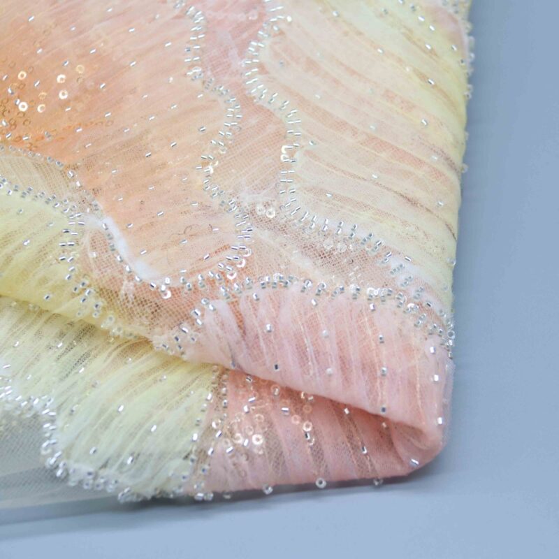 Luxurious polyester lace combines dimensional texture with a dreamy ombré effect, creating fabric that catches and reflects light from every angle. Lightweight mesh base ensures breathability while maintaining structure, making it perfect for evening gowns, bridal wear, overlays, or statement pieces demanding elegance and sophistication.