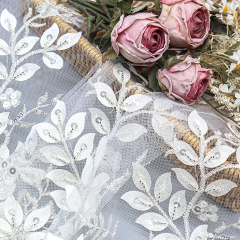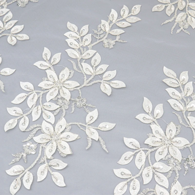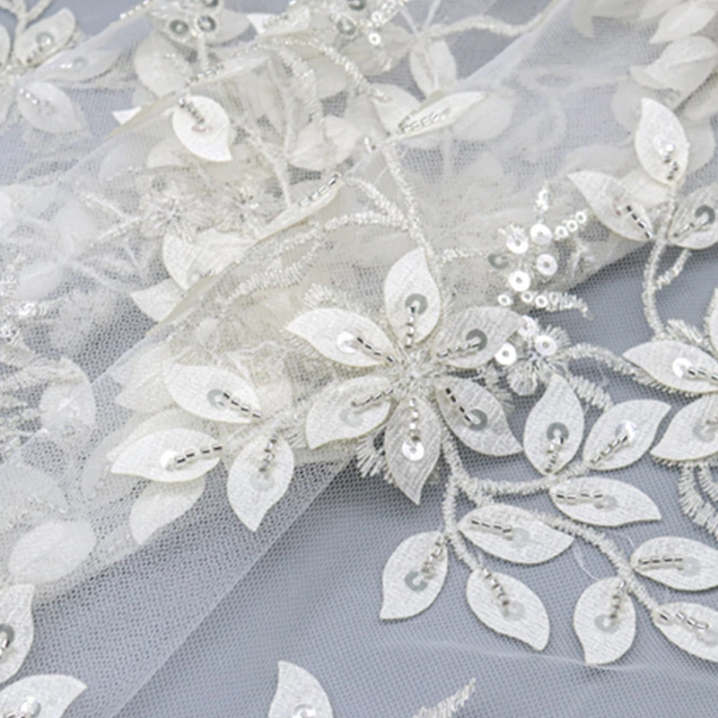 Detailed view of white lace fabric adorned with sequins and delicate white flowers