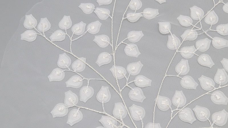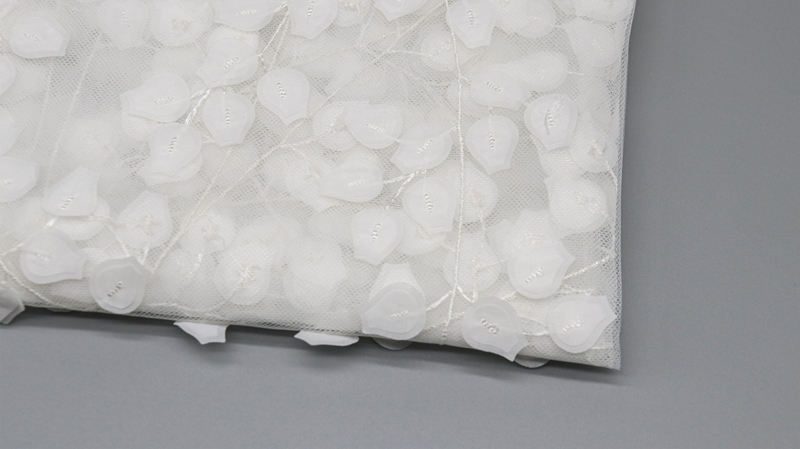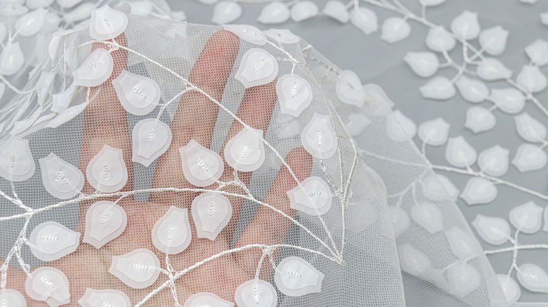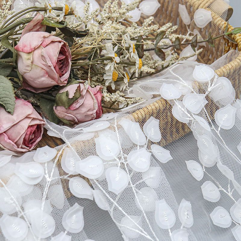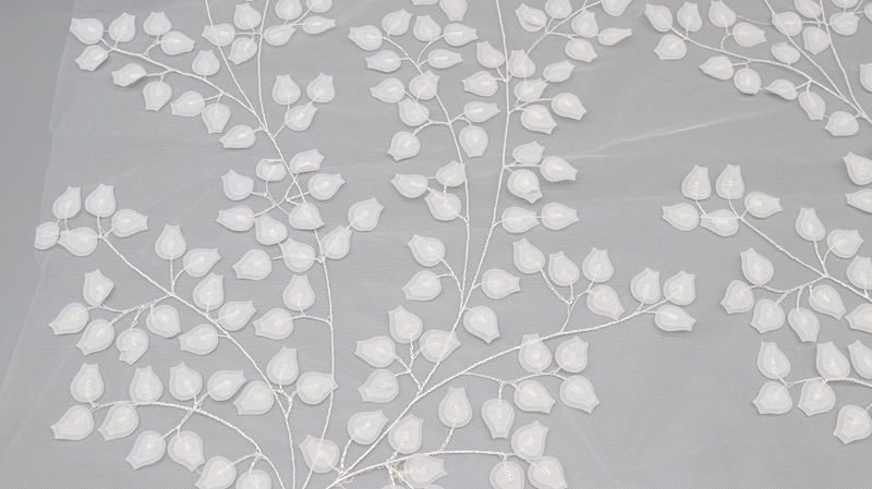 Elevate your bridal creations with our Factory Wholesale Bridal Lace Fabric. Crafted from eco-friendly recycled materials, this exquisite 3D lace features an intricate leaf design, perfect for wedding dresses, veils, and special occasion garments. Its delicate texture and timeless elegance make it an ideal choice for the modern bride.