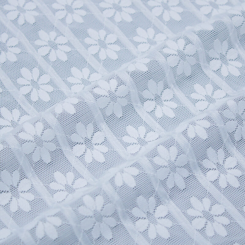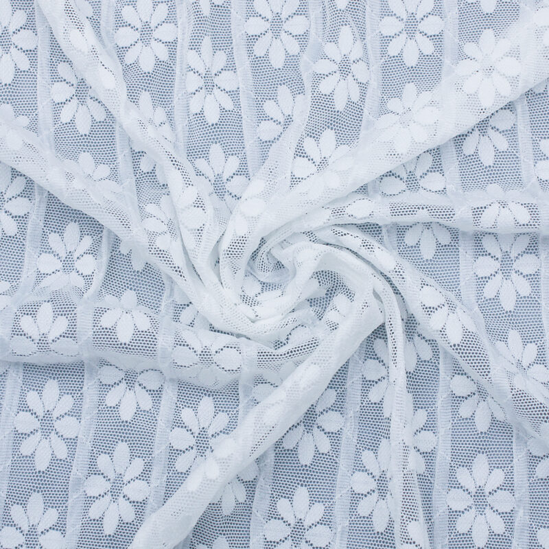 The nylon-spandex blend delivers comfortable stretch and recovery, ideal for lingerie, activewear overlays, bridal wear, and evening fashion.