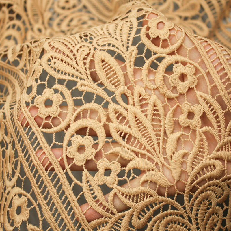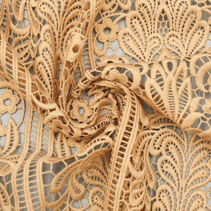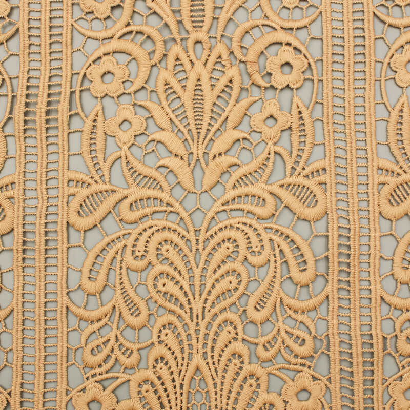 The warm, honeyed tone evokes the soft glow of golden hour—that fleeting time when everything seems touched by enchantment. Perfect for creating romantic gowns, elegant overlays, or sophisticated home décor, this polyester lace offers both durability and timeless beauty.