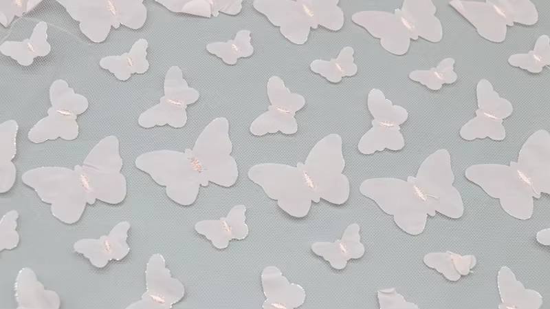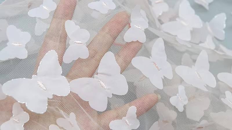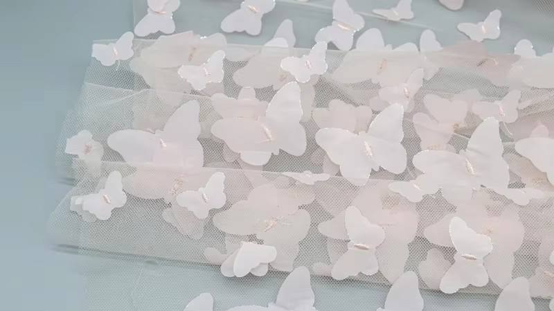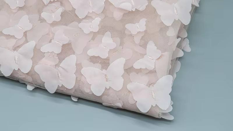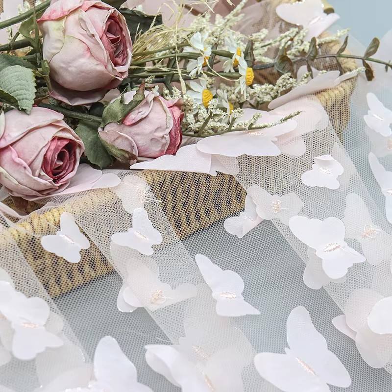 Elevate your bridal designs with our Hot Selling Polyester 3D Butterfly Applique Tulle Mesh Bridal Lace Fabric. This exquisite lace features intricate butterfly appliqués, perfect for creating stunning wedding dresses and enchanting girls’ gowns. Soft, durable, and lightweight, it adds a touch of elegance to any special occasion attire.