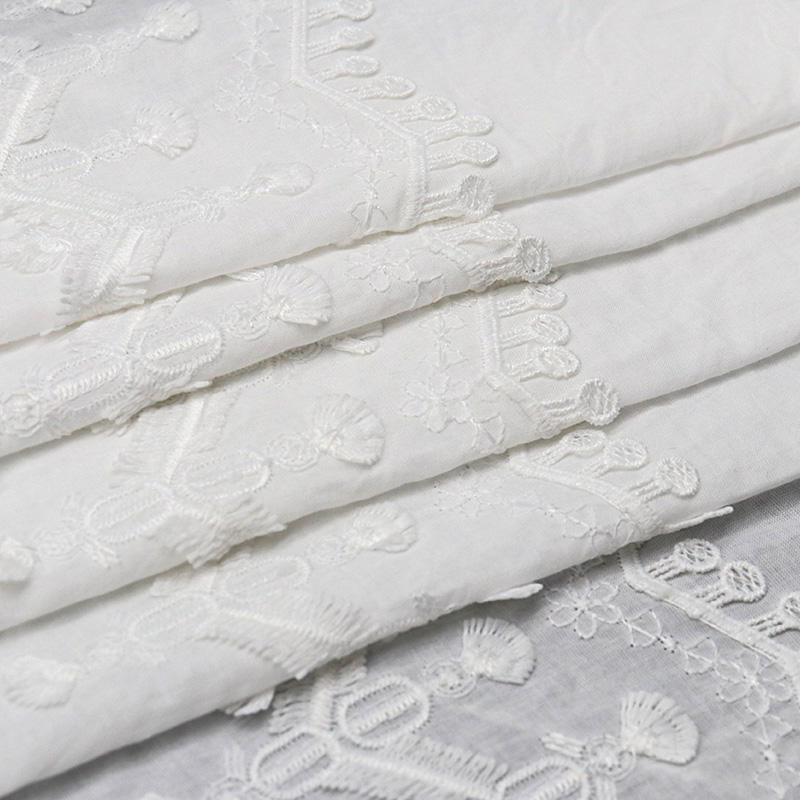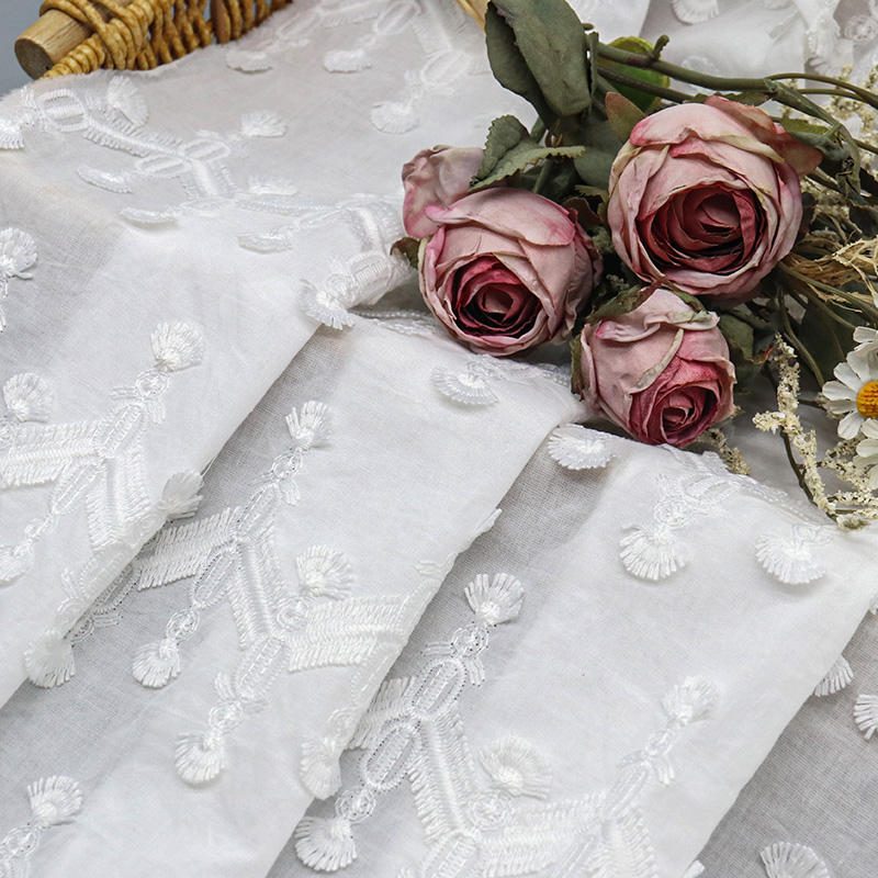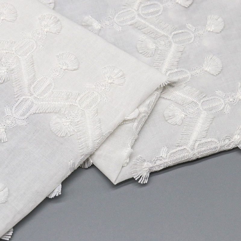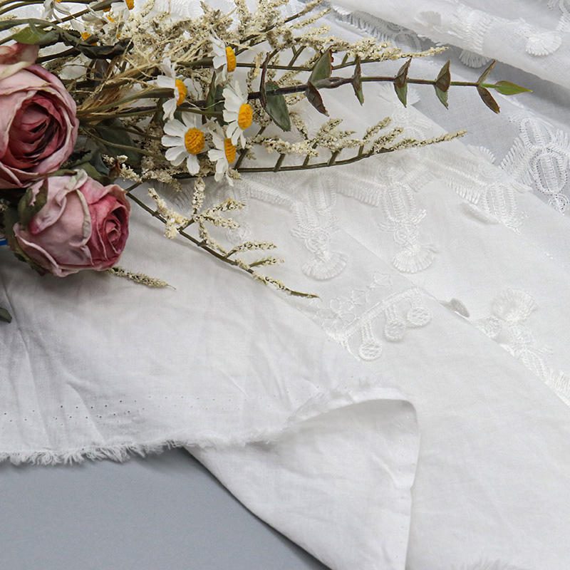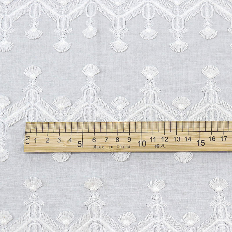 Stay on trend with our Hot Selling Tassel White Lace. This unique geometry embroidery fabric combines the natural feel of cotton with the durability of polyester, featuring a dynamic fringe effect that adds movement and modern flair to any fashion collection.