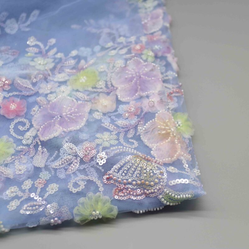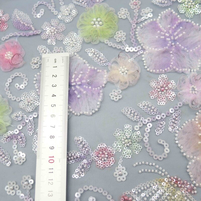 Delicate three-dimensional flowers in soft lavender, blush pink, buttercream, and sage bloom across a refined gray-blue tulle base, each petal carefully outlined with luminous pearl beading and iridescent sequins.