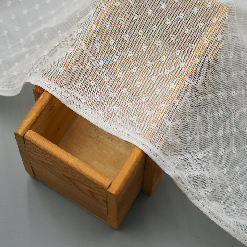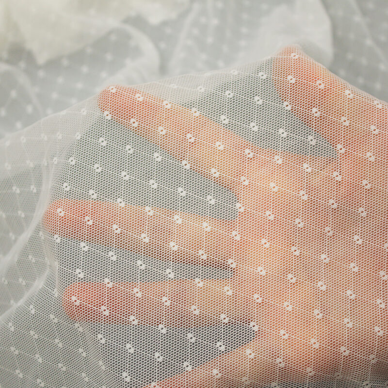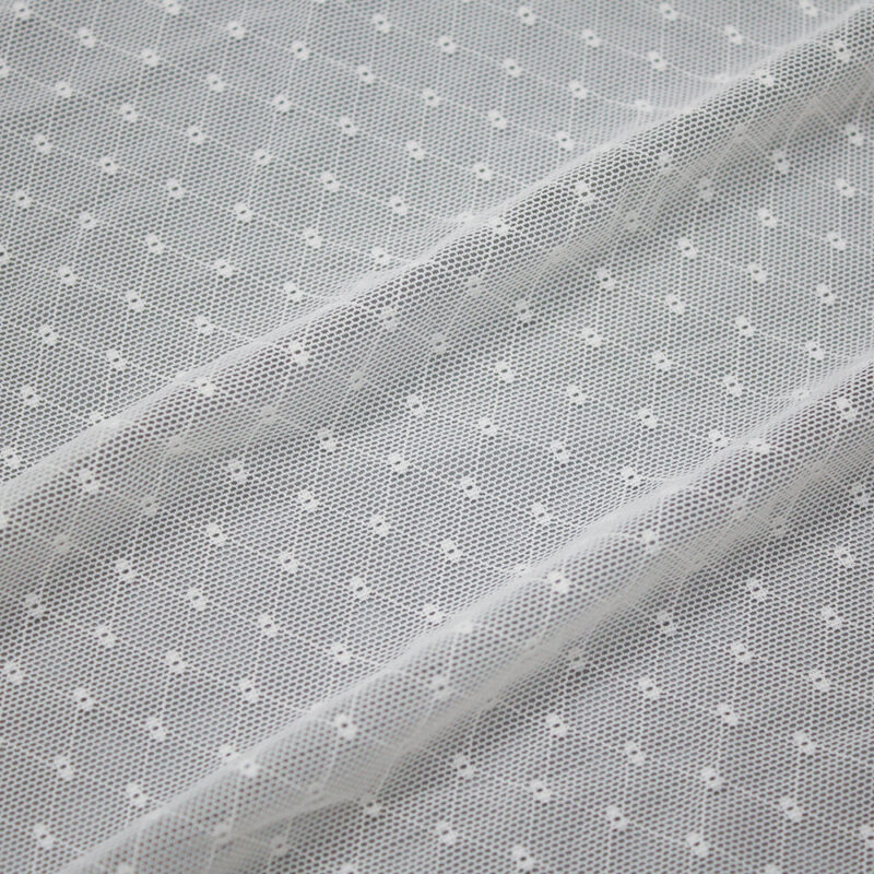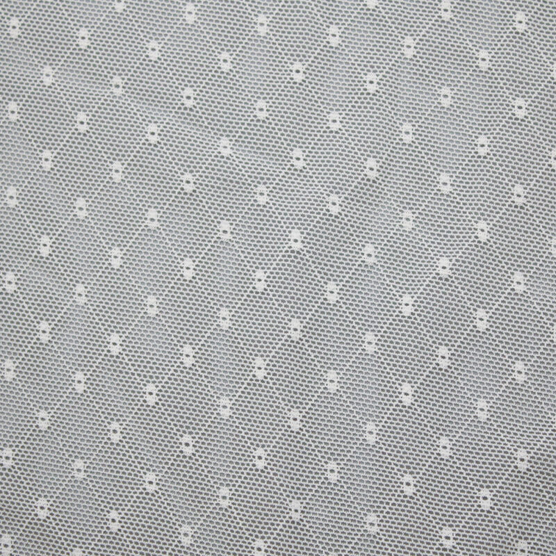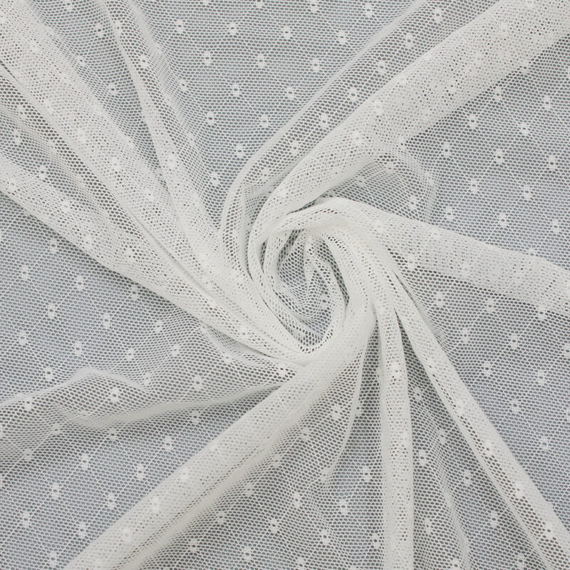 Delicate and versatile Swiss dot lace fabric features a classic dotted mesh pattern in crisp white.