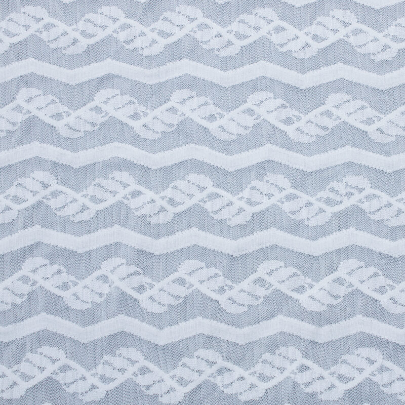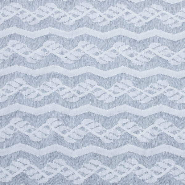 White lace fabric featuring a repeating pattern of blue and white designs